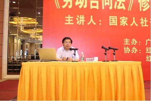 2012年5月19日,由廣州人力資源管理人學(xué)會主辦,紅海人力集團(tuán)、紅日教育培訓(xùn)集團(tuán)協(xié)辦,國家人社部司長余明勤主講的“《勞動合同法》修改與企業(yè)管理專題講座”在廣信江灣新城大酒店商業(yè)中心五樓國際宴會廳圓滿結(jié)束。市勞動局政策法規(guī)處沈源處長;勞動關(guān)系處吳林濤處長;信訪舉報中心陳健明主任出席了此次講座。