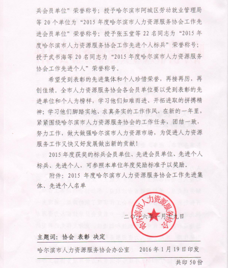 2016年1月哈爾濱市人力資源服務(wù)協(xié)會(huì)在哈爾濱市報(bào)業(yè)大廈召開了第十三次常務(wù)理事(擴(kuò)大)會(huì)議暨年度工作會(huì)議,會(huì)議表彰了2015度哈爾濱市人力資源服務(wù)協(xié)會(huì)工作先進(jìn)集體、先進(jìn)個(gè)人。哈爾濱紅海人力資源有限公司榮獲2015年度哈爾濱市人力資源服務(wù)協(xié)會(huì)先進(jìn)會(huì)員單位、總經(jīng)理戴麗莉女士榮獲先進(jìn)個(gè)人標(biāo)兵稱號。