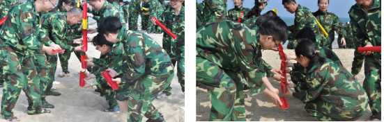根據(jù)現(xiàn)場人數(shù)情況,按照金額一元和五角對隊員進(jìn)行分組,圍成一個圓圈順時針跑動,在接收到教練金額報數(shù)之后,抱在一起總金額不符的組員將受到懲罰。此活動體現(xiàn)出隊員們應(yīng)對問題的靈活度及彼此之間的默契,通過肢體接觸和眼神溝通,加深隊員們之間的感情。