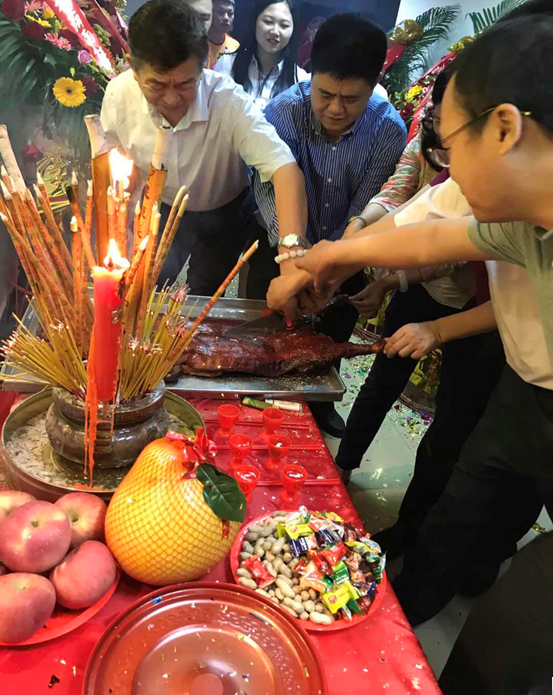 10月22日上午9:00舞獅響鑼鼓迎來賓,海南紅海新址喬遷慶典正式開始。09:30由葉忠亮總裁點大香大燭、拜神燒衣,接著由片區(qū)領導、海南公司領導、嘉賓及員工依次上香。09:45由集團領導葉忠亮總裁致詞:在十九大召開之際,迎來海南紅海公司喬遷之喜,祝海南公司在新時代迎來新局面,打開新篇章,創(chuàng)造新佳績。并邀請來賓勞動協(xié)會羊?qū)W裘會長發(fā)表致詞:恭賀海南紅海公司喬遷新居,祝生意興隆,輝煌騰達。10:30進入揭牌環(huán)節(jié),由葉忠亮總裁、戴肖波董事長助理等領導及來賓揭牌并切烤乳豬。