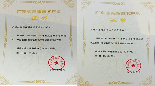 2014年12月,由紅海網(wǎng)絡(luò)科技公司自主研發(fā)的“紅海檔案影印管理軟件”、“紅海工作流管理軟件”、“紅海精益勞動力管理軟件”、“紅海移動外勤管理軟件”經(jīng)過申報、專家評審、公示、申訴處理等一系列相關(guān)程序,通過廣東省高新技術(shù)企業(yè)協(xié)會審查核實,被認定為廣東省高新技術(shù)產(chǎn)品,并獲得高新技術(shù)產(chǎn)品證書。該項榮譽的獲得表明,紅海網(wǎng)絡(luò)科技公司在產(chǎn)品創(chuàng)新程度和技術(shù)研發(fā)能力上已然達到國內(nèi)先進水平,具備極高的技術(shù)含量和廣闊的市場前景,該項榮譽對促進紅??萍脊镜陌l(fā)展、贏得市場的認可起到積極的作用。同時,高新技術(shù)產(chǎn)品證書既是企業(yè)對外宣傳的名片,又是一筆重要的無形資產(chǎn),對提高企業(yè)的知名度和核心競爭力有著極其深遠的意義。