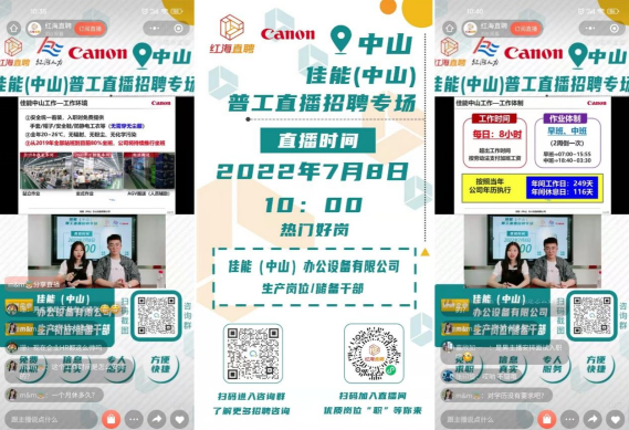 近日,為了讓求職者更全面、更直觀地了解招聘的信息,人事事務舉辦了一場佳能(中山)普工專場線上直播招聘會,吸引了眾多求職者和粉絲觀看和參與互動。