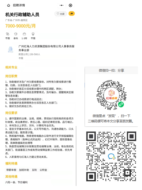 2022年10月,紅海人力集團(tuán)人事事務(wù)服務(wù)事業(yè)部正式與廣州市人力資源和社會(huì)保障局簽訂書面合同,為項(xiàng)目提供人員招聘、勞動(dòng)合同管理、入職離職、考勤、薪酬計(jì)發(fā)、社保公積金繳納、福利待遇發(fā)放等一系列人力資源管理服務(wù),目前正在火熱招聘項(xiàng)目人員,薪酬待遇從優(yōu),歡迎廣大有意向的求職者掃描二維碼投遞簡歷應(yīng)聘。加入我們的求職社群,還可以獲取更多政府機(jī)關(guān)單位、央國企單位崗位信息。