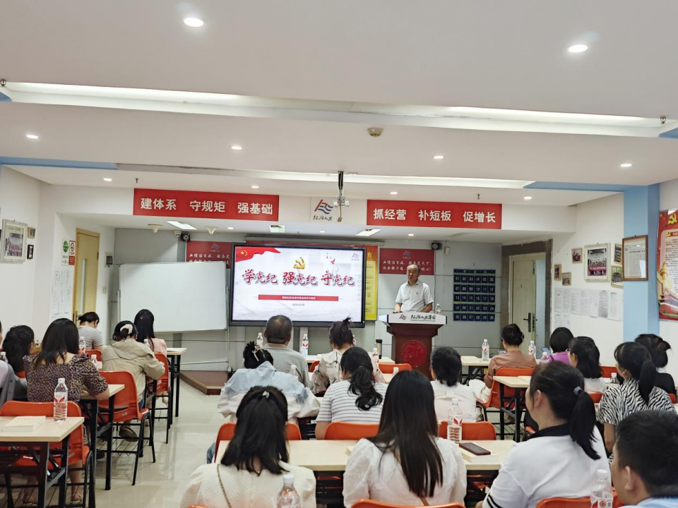 在觀看完教育片之后,湖南紅海黨支部書記馮治安同志給大家講解《學黨紀 強黨紀 守黨紀》專題黨課,馮書記詳細闡述了黨紀的各個方面,主要講述政治紀律、組織紀律、廉潔紀律、群眾紀律、工作紀律、生活紀律這六大紀律。