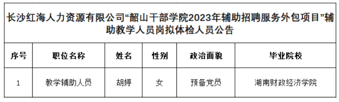 根據(jù)2023年10月16日公司面向社會(huì)發(fā)布的“關(guān)于長(zhǎng)沙紅海人力資源有限公司招聘1名教學(xué)輔助服務(wù)人員派駐至韶山干部學(xué)院工作的公告”招聘公告相關(guān)要求,經(jīng)過現(xiàn)場(chǎng)報(bào)名、資格審查、適崗評(píng)價(jià)和綜合考核程序,確定1人為教學(xué)輔助人員崗擬體檢人員,現(xiàn)予以公示。公示期間,接受群眾監(jiān)督,如有問題,請(qǐng)向長(zhǎng)沙紅海人力資源有限公司招聘部反映。
