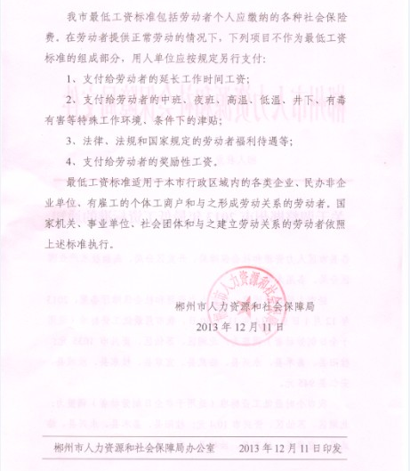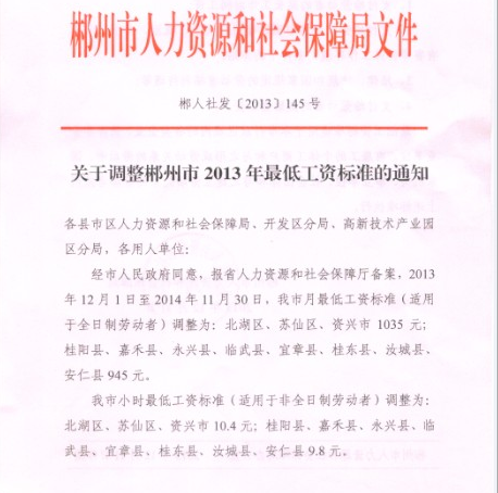 關于調整郴州市2013年最低工資標準的通知