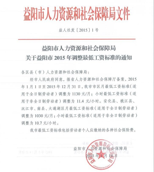 關(guān)于益陽市2015年調(diào)整最低工資標(biāo)準(zhǔn)的通知