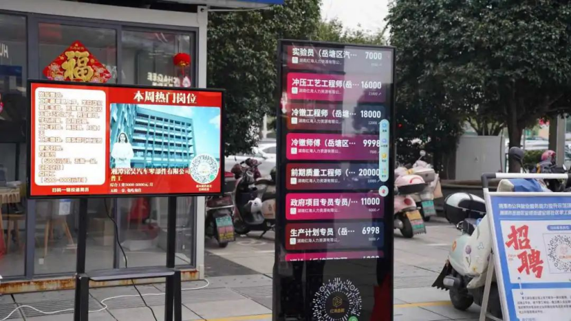 活動現(xiàn)場有兩臺"移動職播機"全天候播放數(shù)字人帶崗視頻,其中內(nèi)容有企業(yè)實景探崗Vlog沉浸式展現(xiàn)工作場景,還有一臺觸屏一體機實現(xiàn)"掃碼即投"智能求職,墻壁上掛有LED大屏實時滾動數(shù)字人介紹崗位職責(zé)及薪資待遇。同時線上線下聯(lián)動,紅海直聘直播間同步開啟"云求職"模式,主播現(xiàn)場教學(xué)簡歷投遞技巧,讓科技為就業(yè)加速!