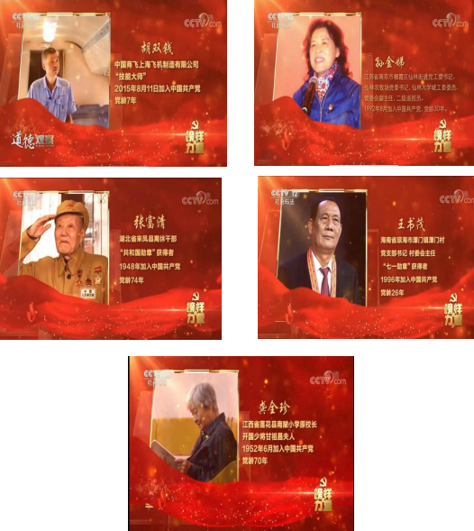 為慶祝建黨101周年,大力宣傳全國優(yōu)秀共產(chǎn)黨員、全國先進基層黨組織的先進事跡,中央組織部黨員教育中心聯(lián)合中央廣播電視臺社教節(jié)目中心,將《榜樣的力量(第一季)》電視節(jié)目宣傳的先進典型事跡短片精剪成5集,在中央電視臺社會與法頻道(CCTV12)《道德觀察》欄目播出。