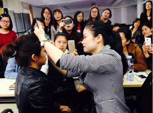 當(dāng)然,陰暗面基本理論和眉毛技巧只是化妝課程的一部分。接下來(lái),專(zhuān)業(yè)老師為女學(xué)員講解了職業(yè)妝容的畫(huà)法。在講述了基本底妝和妝容顏色搭配之后,專(zhuān)業(yè)老師邀請(qǐng)了其中的一名女學(xué)員作為模特,現(xiàn)場(chǎng)示范職業(yè)妝的畫(huà)法。各位女學(xué)員爭(zhēng)前恐后擠到了講臺(tái),紛紛拿出手機(jī)、筆和本子,認(rèn)真記錄老師說(shuō)的要點(diǎn),生怕遺漏化妝的精髓。一番觀(guān)察過(guò)后,她們回到座位上,拿起化妝刷,當(dāng)起小小化妝師。