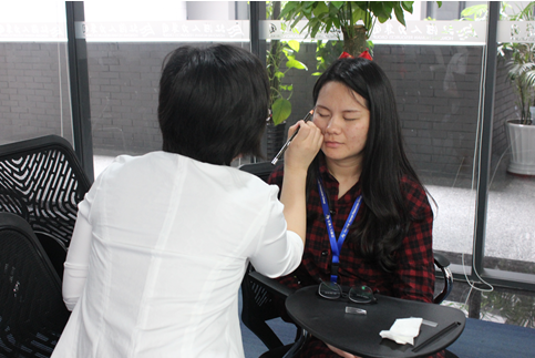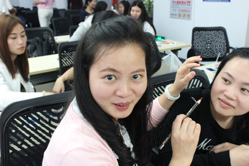 但是僅僅讓學(xué)員在畫(huà)紙上實(shí)踐是不能夠滿(mǎn)足她們對(duì)學(xué)習(xí)化妝的內(nèi)心渴求。于是,專(zhuān)業(yè)老師迅速講授眉毛的技巧,包括眉形的塑造,修眉和畫(huà)眉,其中精致的眉毛要注意眉頭、眉峰和眉尾的長(zhǎng)度控制。女學(xué)員一聽(tīng),如獲至寶,與旁邊的小伙伴相互練習(xí)起來(lái),我們鴻日的同事也當(dāng)起了模特,為學(xué)員做示范。