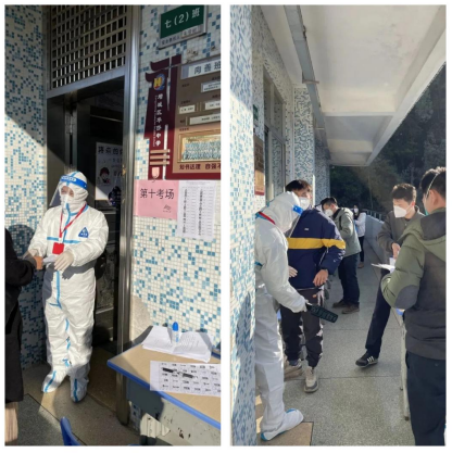 對于考場疫情防控這一塊,根據(jù)《新型冠狀病毒肺炎防控方案(第九版)》、《關(guān)于進一步優(yōu)化新冠肺炎疫情防控措施科學(xué)精準做好防控工作的通知》(聯(lián)防聯(lián)控機制綜發(fā)〔2022〕101 號)、《關(guān)于進一步優(yōu)化落實新冠肺炎疫情防控措施的通知》(聯(lián)防聯(lián)控機制綜發(fā)〔2022〕113 號)以及我省新冠肺炎疫情防控最新要求,要求在場的工作人員穿戴防護服,并且考生進場需佩戴N95或KN95口罩,加強個人防護。另外對于體溫異常的考生,有專門的工作人員帶到備用考場進行考試。