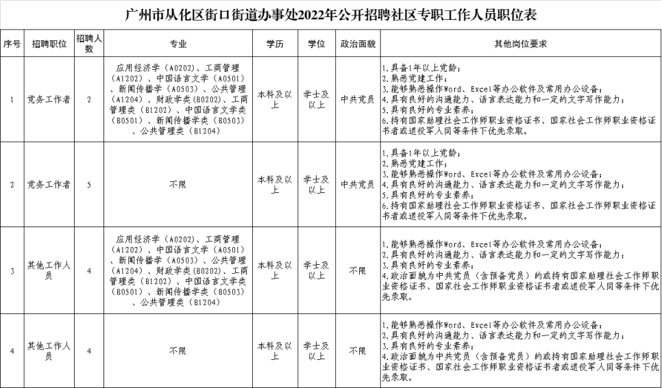 本公告解釋權(quán)歸廣州市從化區(qū)街口街道辦事處2022年社區(qū)專職工作人員招聘辦。