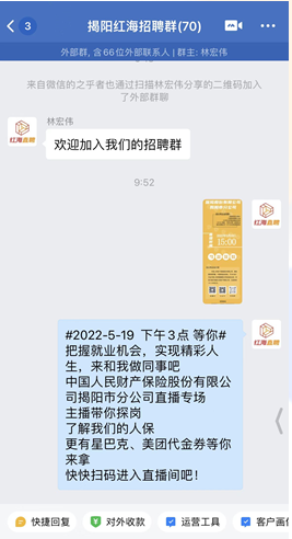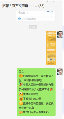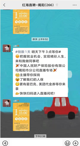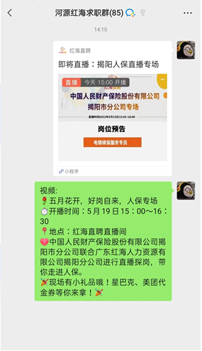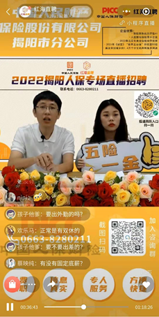 人民財產(chǎn)保險股份有限公司揭陽市分公司(以下簡稱揭陽人保)聯(lián)合廣東紅海人力資源有限公司揭陽分公司(以下簡稱揭陽紅海)于2022年5月19日15:00-16:00開展的《中國人民財產(chǎn)保險股份有限公司揭陽市分公司招聘直播專場》圓滿結(jié)束。