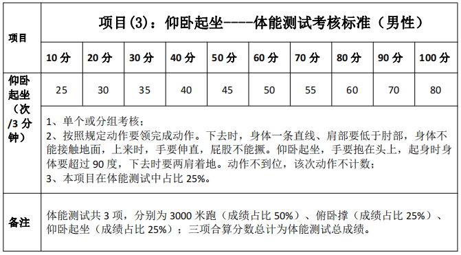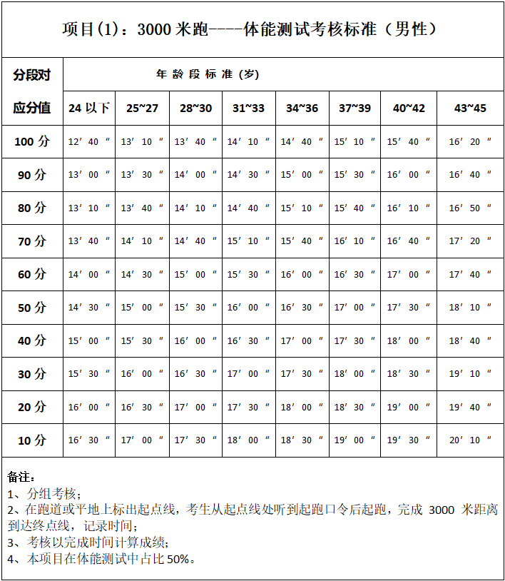 (2)體能測(cè)試3項(xiàng)。分別為3000米跑(成績(jī)占比50%)、俯臥撐(成績(jī)占比25%)、仰臥起坐(成績(jī)占比25%)(體能測(cè)試評(píng)分見(jiàn)附件)。