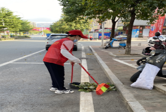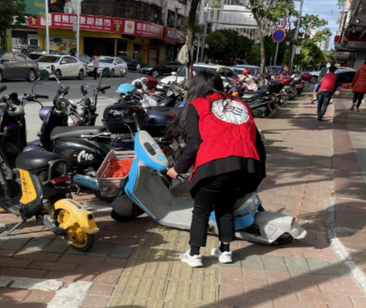 11月28日,河源紅海全體員工正在行動。勸導不文明交通行為、對于亂停亂放的共享電動車擺放整齊、打掃街道清理落葉、垃圾等。