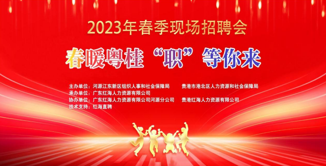 本次由河源江東新區(qū)組織人事和社會(huì)保障局、貴港市港北區(qū)人力資源和社會(huì)保障局主辦,廣東紅海人力資源有限公司承辦,廣東紅海人力資源有限公司河源分公司、貴港紅海人力資源有限公司協(xié)辦的“春暖粵桂,職等你來(lái)”現(xiàn)場(chǎng)招聘會(huì)于4月8日至4月9日?qǐng)A滿結(jié)束!