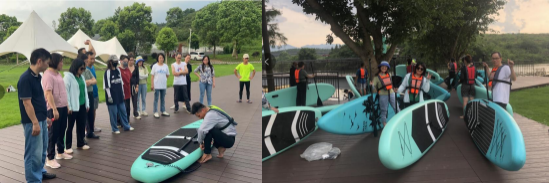 等教練講解完注意事項(xiàng),大家都摩拳擦掌、躍躍欲試,迫不及待 地帶上各自的皮筏艇下水一展身手。大家很快就熟練掌握了水上劃船 技巧,盡情欣賞著湖面上的美景,呼吸著新鮮的空氣,盡情享受著劃 船帶來(lái)的樂(lè)趣,大家不時(shí)發(fā)出歡樂(lè)的笑聲,或互相打水戰(zhàn)、或并排劃 行,交流家庭發(fā)生的趣事、或互相競(jìng)逐。岸上的隊(duì)員則給大家拍照,記錄此刻美好的瞬間和歡聲笑語(yǔ)的隊(duì)員們。