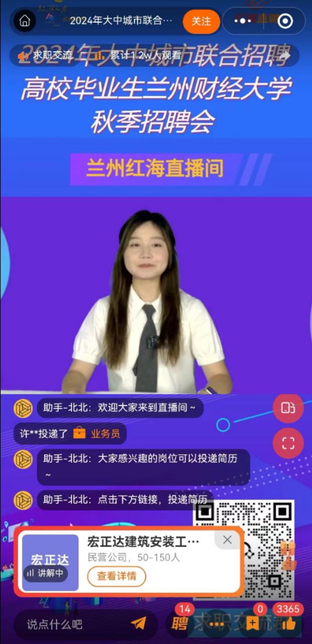 本次活動,由新組建的一支就業(yè)創(chuàng)業(yè)團隊在驛站內(nèi)開展直播帶崗,為直播間的大學生們生動、詳細地介紹各類崗位信息,并積極與大學生進行互動交流,直播間吸引了近5萬人次的在線觀看,進一步拓寬了招聘信息的傳播渠道,為未能到現(xiàn)場的學生提供了廣泛的就業(yè)機會。