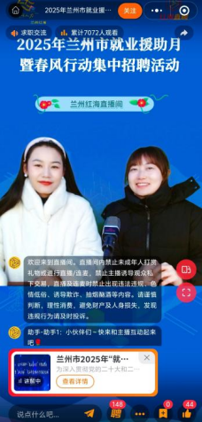 直播帶崗期間,主播在線推介35家招聘單位及283個就業(yè)崗位,使無法親臨招聘現(xiàn)場的求職者也能輕松獲取豐富的職位信息,還特別邀請榆中縣人民政府副縣長李敬強做客直播間,詳細分享了近期推出的多項惠及民生、支持就業(yè)創(chuàng)業(yè)的利好政策。隨后,深圳匯合發(fā)展有限公司蘭州分公司的企業(yè)代表進入直播間,介紹企業(yè)文化、招聘崗位、薪資待遇等信息,并與求職者進行實時互動,實時解答求職者的問題,直播間吸引7076人在線觀看參與,平臺投遞簡歷63份。