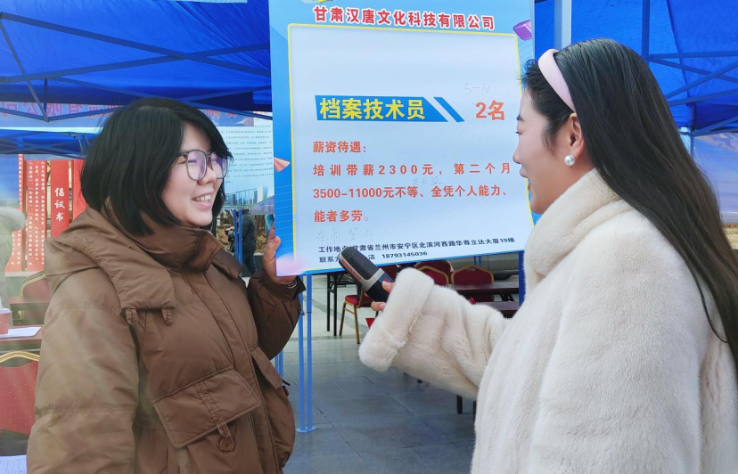 蘭州紅海主播引領鏡頭走進招聘會現(xiàn)場,對甘肅漢唐文化科技有限公司、甘肅質(zhì)恩商貿(mào)有限公司等5家企業(yè)代表進行采訪和互動。企業(yè)代表詳細介紹了企業(yè)背景、發(fā)展狀況以及招聘崗位的具體職責、任職要求等內(nèi)容,便于求職者了解企業(yè)的用工需求。