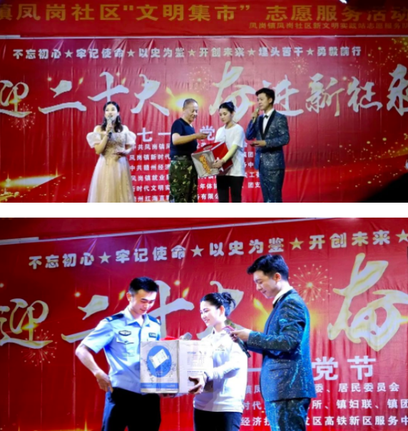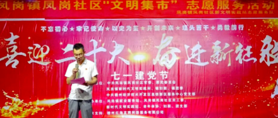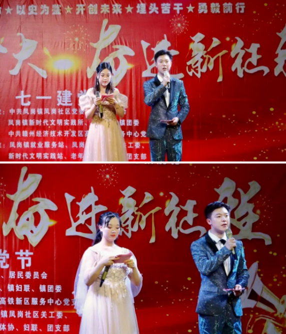 為慶祝建黨一百零一周年,由中共鳳崗鎮(zhèn)社區(qū)黨委、居民委員會(huì)、鳳崗鎮(zhèn)新時(shí)代文明實(shí)踐所、鎮(zhèn)婦聯(lián)、鎮(zhèn)團(tuán)委、中共贛州經(jīng)濟(jì)技術(shù)開(kāi)發(fā)區(qū)高鐵新區(qū)服務(wù)中心黨支部主辦;由鳳崗鎮(zhèn)就業(yè)服務(wù)站、鳳崗鎮(zhèn)鳳崗社區(qū)關(guān)工委、新時(shí)代文明實(shí)踐站、老年體協(xié)、婦聯(lián)、團(tuán)支部承辦;由贛州紅海直聘網(wǎng)絡(luò)服務(wù)有限公司負(fù)責(zé)技術(shù)支持的建黨101周年文藝匯演節(jié)目于2022年7月1日晚拉開(kāi)序幕。