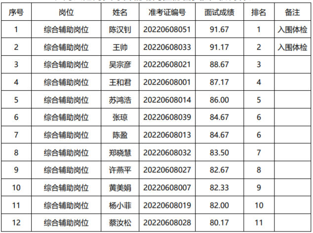 一、??诟酆jP(guān)綜合輔助崗位協(xié)管員面試成績(jī)表