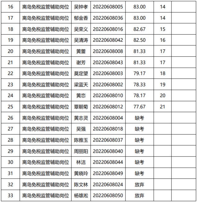 二、海口港海關(guān)離島免稅監(jiān)管輔助崗位協(xié)管員面試成績(jī)表
