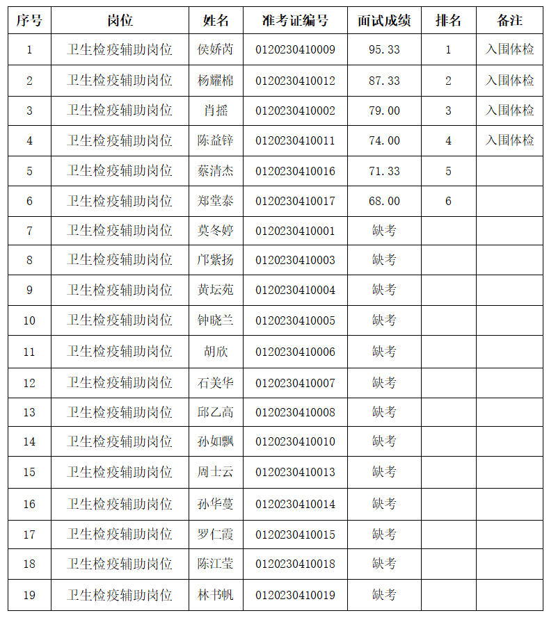 一、??诿捞m機場海關衛(wèi)生檢疫輔助崗位協(xié)管員面試成績表