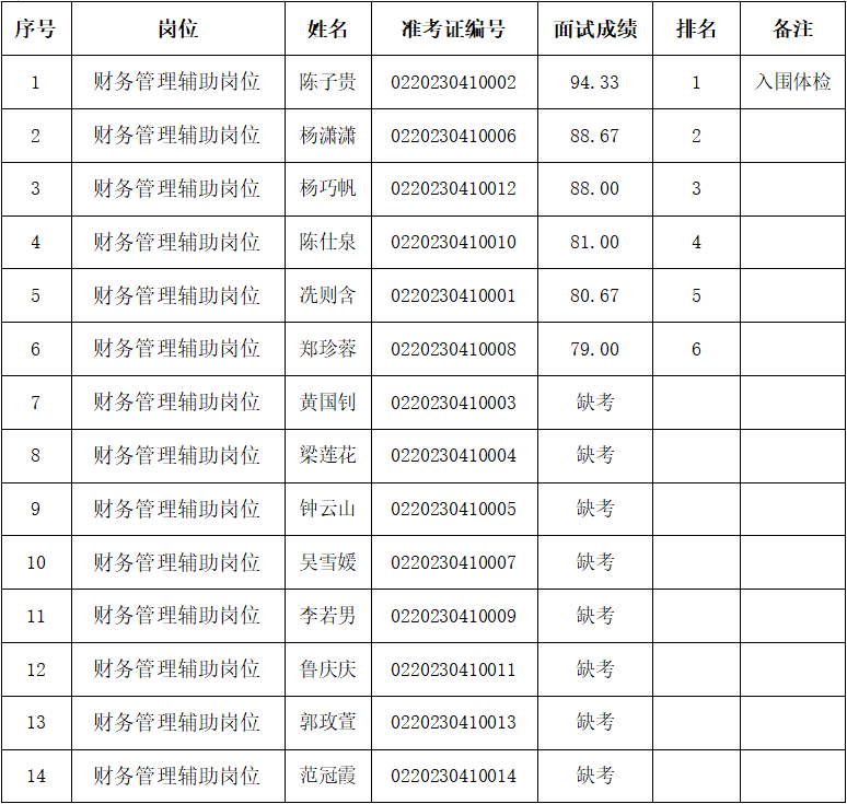 以下入圍體檢人員,體檢具體時間和地點另行短信通知,體檢費用由考生自行承擔。