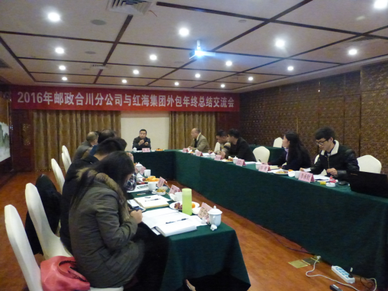 2016年12月26日,嘉陵江畔,古城合川——恭州大酒店二樓會議室,重慶紅海與中郵合川分公司2016年外包項目總結(jié)交流會于下午15時30分準(zhǔn)時召開。會上,雙方就目前合作項目和來年業(yè)務(wù)展望進(jìn)行了全面總結(jié)和廣泛交流,經(jīng)探討研究,達(dá)成全面深化合作基本共識,為重慶紅海2017年開展外包工作夯實了基礎(chǔ),指明了方向。參加會議的有中郵合川分公司黨委書記、總經(jīng)理陳俊,紀(jì)委書記、副總陳齊民及各職能業(yè)務(wù)部門負(fù)責(zé)人共9人。重慶紅海出席會議的有副經(jīng)理婁心靜,市場部經(jīng)理李永朋及合川、鴛鴦?wù)?、黔江項目?jīng)理。會議由重慶紅海許建良主持。