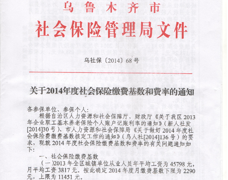 烏魯木齊市關(guān)于2014年度社會保險繳費基數(shù)和費率的通知