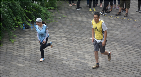 在“趾壓板接力賽”中,全員參與,男女合作,整個活動達到高潮。在各隊比賽的時候,待賽區(qū)其他隊的隊員都為比賽隊員鼓勵,加油的聲音覆蓋整個賽場。