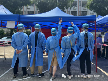 當(dāng)天的核酸檢測工作于下午兩點正式開始,瀚洋人才的小伙伴們?yōu)榱烁玫嘏浜辖值擂k的工作,早早達(dá)到現(xiàn)場。脫去日常的白襯衫,穿上這身防護(hù)裝備,讓他們更有使命感!