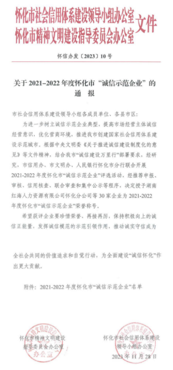 2023年11月,湖南省懷化市組織開展了2021—2022年度懷化市“誠信示范企業(yè)”評選活動,經(jīng)政府主管部門及各縣市區(qū)推薦等程序,按照《2021—2022年懷化市“誠信示范企業(yè)”評選活動方案》要求,由市文明辦、市信用辦、市發(fā)改委、中國人民銀行懷化市分行、市民政局、市中級人民法院、市公安局、市財政局、市市場監(jiān)管局、市稅務(wù)局組成的評選組,線上線下評審,最終確定了30戶懷化市“誠信示范企業(yè)”。湖南紅海人力資源有限公司懷化分公司連續(xù)兩年榜上有名。