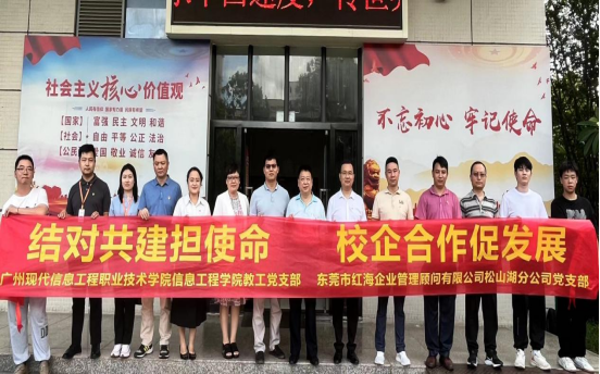 為進一步加強新形勢下基層黨組織建設(shè),貫徹落實黨中央“創(chuàng)新、協(xié)調(diào)、綠色、開放、共享”的發(fā)展理念,強化黨組織之間交流合作,促進資源共享、優(yōu)勢互補,以雙方高質(zhì)量基層黨建共建工作,引領(lǐng)推動雙方高質(zhì)量校企合作,2023年7月5日下午,東莞市紅海企業(yè)管理顧問有限公司松山湖分公司黨支部與廣州現(xiàn)代信息工程職業(yè)技術(shù)學(xué)院信息工程學(xué)院黨總支部開展紅聯(lián)共建交流洽談會議暨黨建結(jié)對共建協(xié)議簽署儀式。