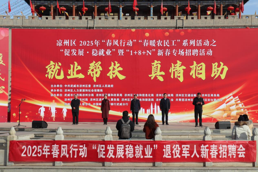 一年春作首,萬事行為先。2月13日(農(nóng)歷正月十六)上午,有區(qū)委區(qū)政府牽頭,涼州區(qū)就業(yè)創(chuàng)業(yè)服務(wù)中心承辦,甘肅紅海人力資源有限公司武威分公司協(xié)辦,在涼州區(qū)南城門廣場(chǎng)舉辦2025年“春風(fēng)行動(dòng)”“春暖農(nóng)民工”系列活動(dòng)之“促發(fā)展·穩(wěn)就業(yè)”暨“1+8+N”新春專場(chǎng)招聘活動(dòng)。區(qū)委副書記、區(qū)長(zhǎng)崔振華出席活動(dòng)并講話。區(qū)委常委、區(qū)委組織部部長(zhǎng)潘慶出席活動(dòng)。區(qū)政府副區(qū)長(zhǎng)張永宏主持活動(dòng)。