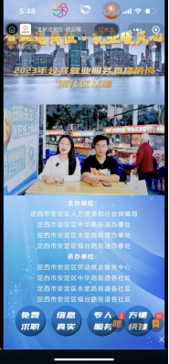 此次活動,是安定區(qū)人社局創(chuàng)新服務(wù),全面考察,結(jié)合企業(yè)需求最終選擇“紅海直聘”作為社區(qū)就業(yè)的直播帶崗平臺。為了更好的服務(wù)社區(qū)居民,吸引更多的求職關(guān)注度,定西紅海直播招聘項目部認(rèn)真籌備每一期活動,在連續(xù)開播一周引起廣泛關(guān)注的基礎(chǔ)上,自9月開始確定每周二、四晚上19:00-21:00時間段進(jìn)行直播帶崗進(jìn)社區(qū)活動。
