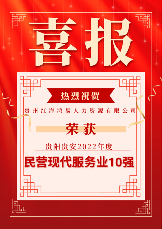 2023年7月27日,貴陽(yáng)貴安推動(dòng)民營(yíng)經(jīng)濟(jì)質(zhì)量發(fā)展大會(huì)在貴陽(yáng)會(huì)議中心隆重召開,貴州省委常委、貴陽(yáng)市委書記胡忠雄,貴陽(yáng)市委副書記、貴陽(yáng)市市長(zhǎng)馬寧宇等領(lǐng)導(dǎo)發(fā)表講話。貴州紅海鴻易人力資源有限公司(簡(jiǎn)稱貴州紅海)受邀參加,并喜獲貴陽(yáng)市2022年度民營(yíng)現(xiàn)代服務(wù)業(yè)十強(qiáng)。